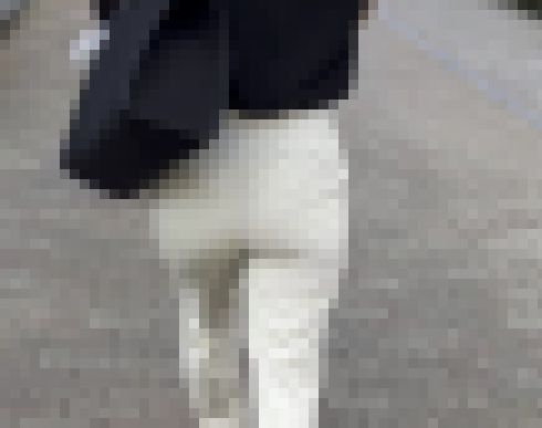 ヒップタインを強調している。2人目は、高級生地の白スラックスパンツで出勤中の大企業OL。
