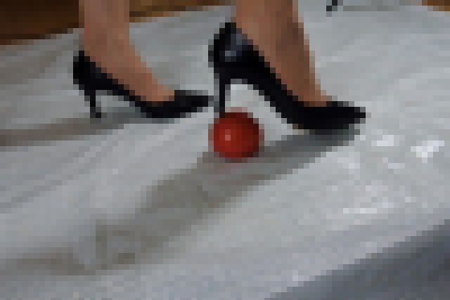 004 ブラックヒールパンプスでトマト踏み